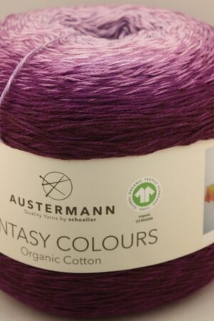 250g / 1000m Austermannin Fantasy Colours (100% GOTS-sertifioitu luomupuuvilla) on laadukas, liukuvärjätty pehmeä luomupuuvillalanka. Yksi jättikerä riittää lyhythihaiseen neulepuseroon, isoon huiviin tai hartiashaaliin. Kahdesta kerästä neulot tai virkkaat keveän kesämekon. Puikot: 3 – 3,5mm Neuletiheys: 24 s / 10cm Pesu: Hienopesu 30C