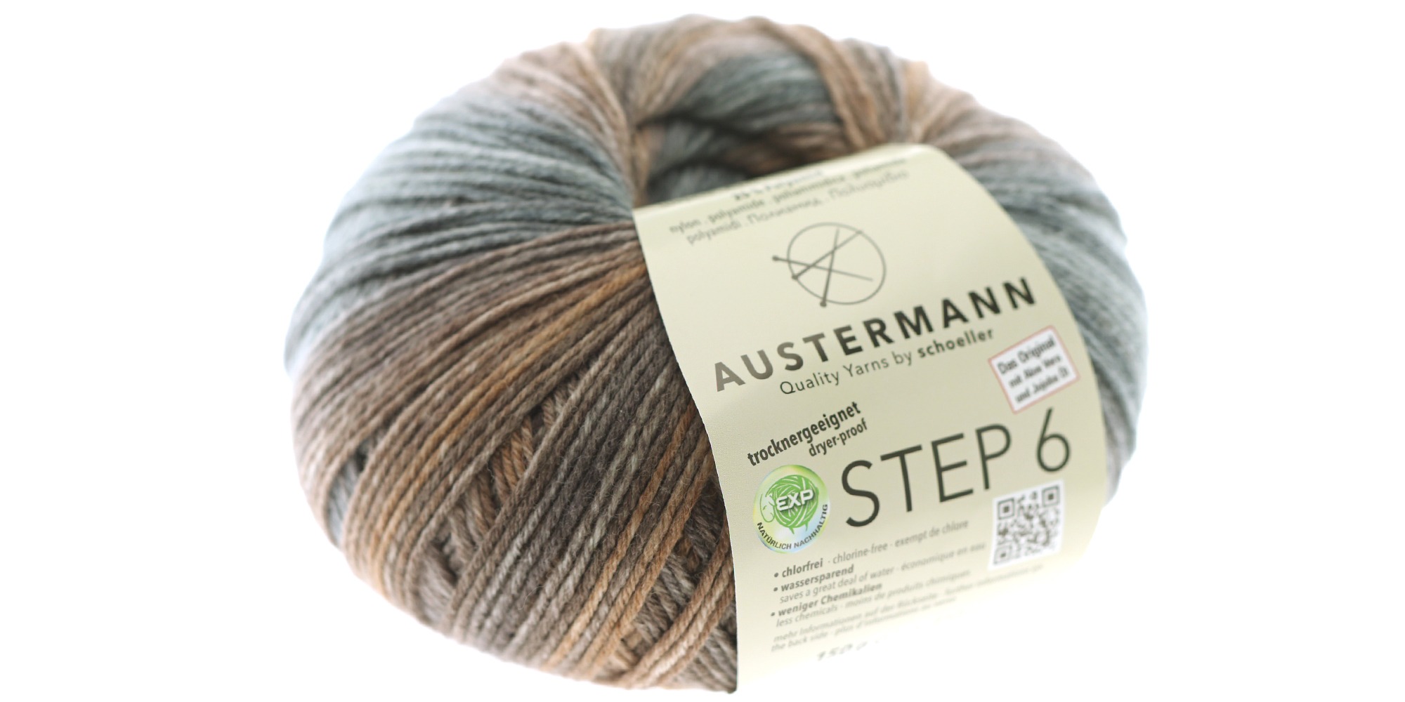 150 g / n. 410 m Austermann Step 6 (75% villa, 25% polyamidi) on suosittu ja laadukas monivärinen sukkalanka, joka on käsitelty jojoba-öljyllä ja aloe veralla. Pehmeytensä ansiosta Step-langat sopivat monipuolisesti erilaisiin neule- ja virkkaustöihin: pipoihin, kaulahuiveihin, puseroihin, neuletakkeihin… Yksi 150g:n kerä riittää aikuisten sukkiin, ja naisten M-kokoiseen puseroon kuluu lankaa n. 4 kerää.
