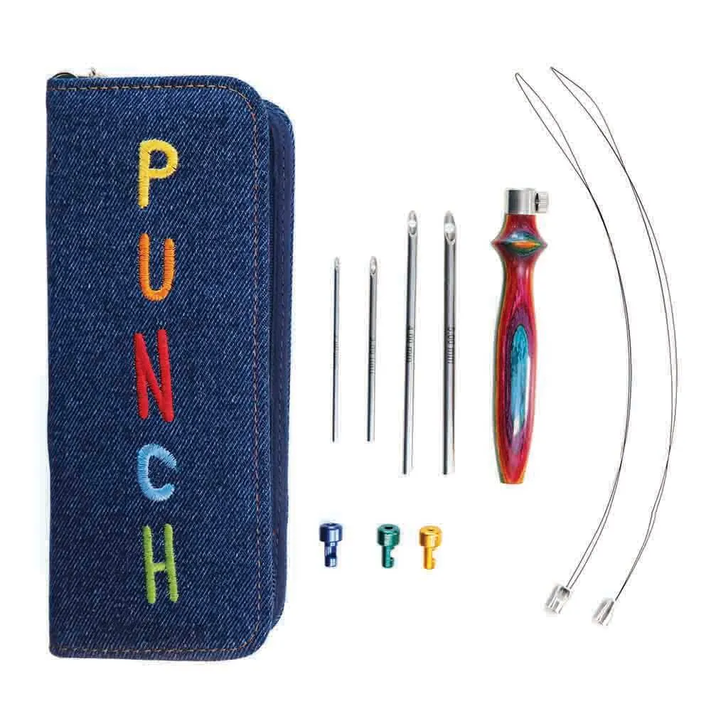 Pakkauksen sisältö: 1 puinen varsi, 4 kpl neuloja, 2 kpl langanpujottimia, 3 kpl adaptereita neuloille, 1 säilytyskotelo sekä kuvalliset ohjeet (Teksti on englanniksi).