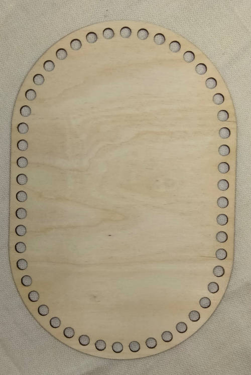 Soikea korinpohja, käsittelemätöntä puuvaneria. Paksuus 3 mm, reikien läpimitta 8 mm.