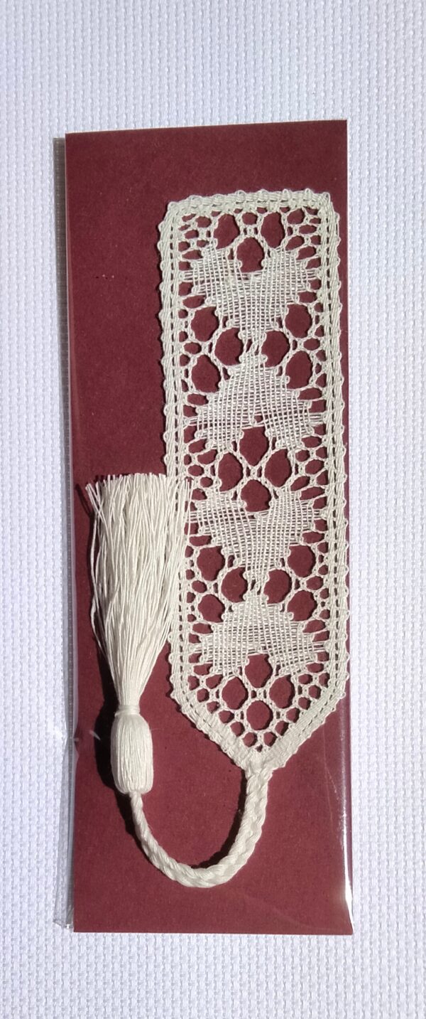Pellavalangasta käsin nyplätty kirjanmerkki.