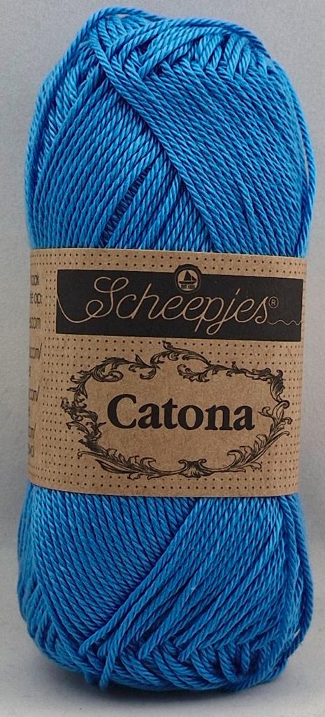50 g / n. 125 m Hollantilaisen Scheepjesin Catona (100 % merseroitu puuvilla) on suosittu, laadukas virkkaus- ja neulelanka, jokas on n. fingering/sport-vahvuinen, projektista riippuen. Pehmeä ja kestävä lanka. Merseroitu puuvilla on hieman kiiltävämpää ja kestävämpää kuin merseroimaton lanka. Catonassa on napakka, hyvä kierre, joten se pitää muotonsa ja sillä saa aikaan siistiä neulosta. Napakan kierteensä vuoksi se on oiva valinta amigurumeihin ja muihin virkkaustöihin sekä kevyisiin neuleisiin. Catona ei nukkaannut helposti, joten se sopii tuotteisiin, joita käsitellään usein.